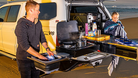 Adding to ARB's existing comprehensive range of Outback Solutions Roller Drawers is the latest fully on-board, integrated and perfectly practical ARB Slide Kitchen, complete with sink!