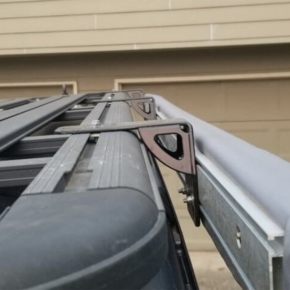 Awning bracket is designed with welded gussets to provide additional strength when awnings are mounted to roof bars on vehicles used off-road or under extreme conditions. Zinc plated and powder coated for corrosion resistance and designed to mount either upright or inverted. Bracket is 50mm wide. Pre-drilled to accept 8mm bolts, at least 2, but preferably 3 bolts should be used to mount to the roof bar for maximum strength. The outer bolt hole between the gussets must always be used for the gusset to be effective. Three slotted 6mm holes are provided to mount the awning.