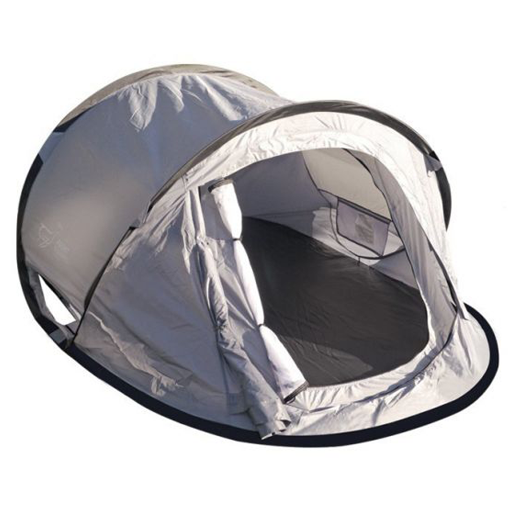 Two person ground tent. Instant set up: Just throw the tent and watch it unfold - then push in the tent stakes. Quickly folds up flat as a pancake. Store away in the heavy duty canvas carry bag with straps to sling over your back or to secure on top of or underneath your roof rack.